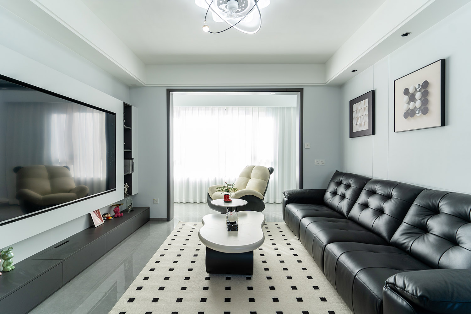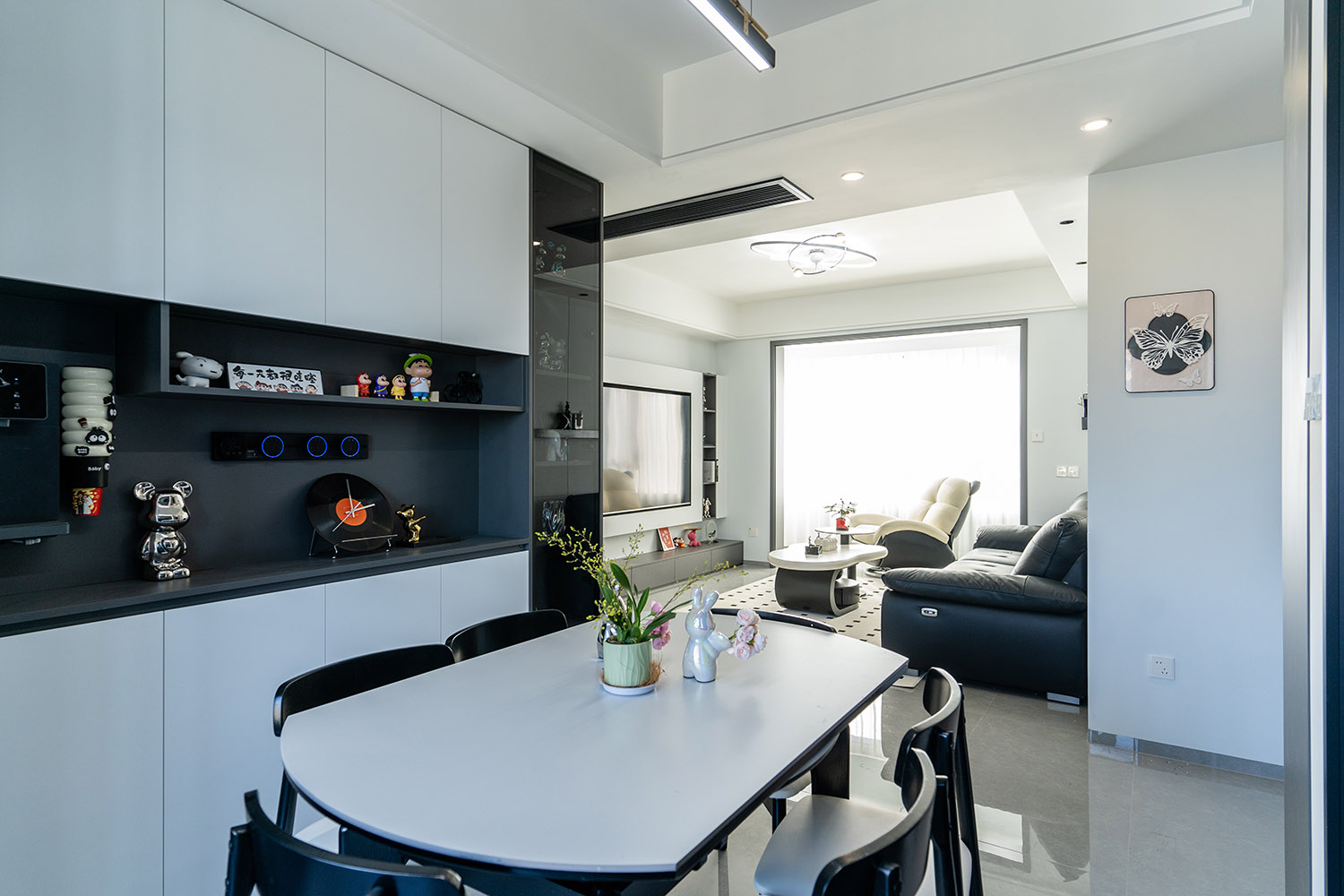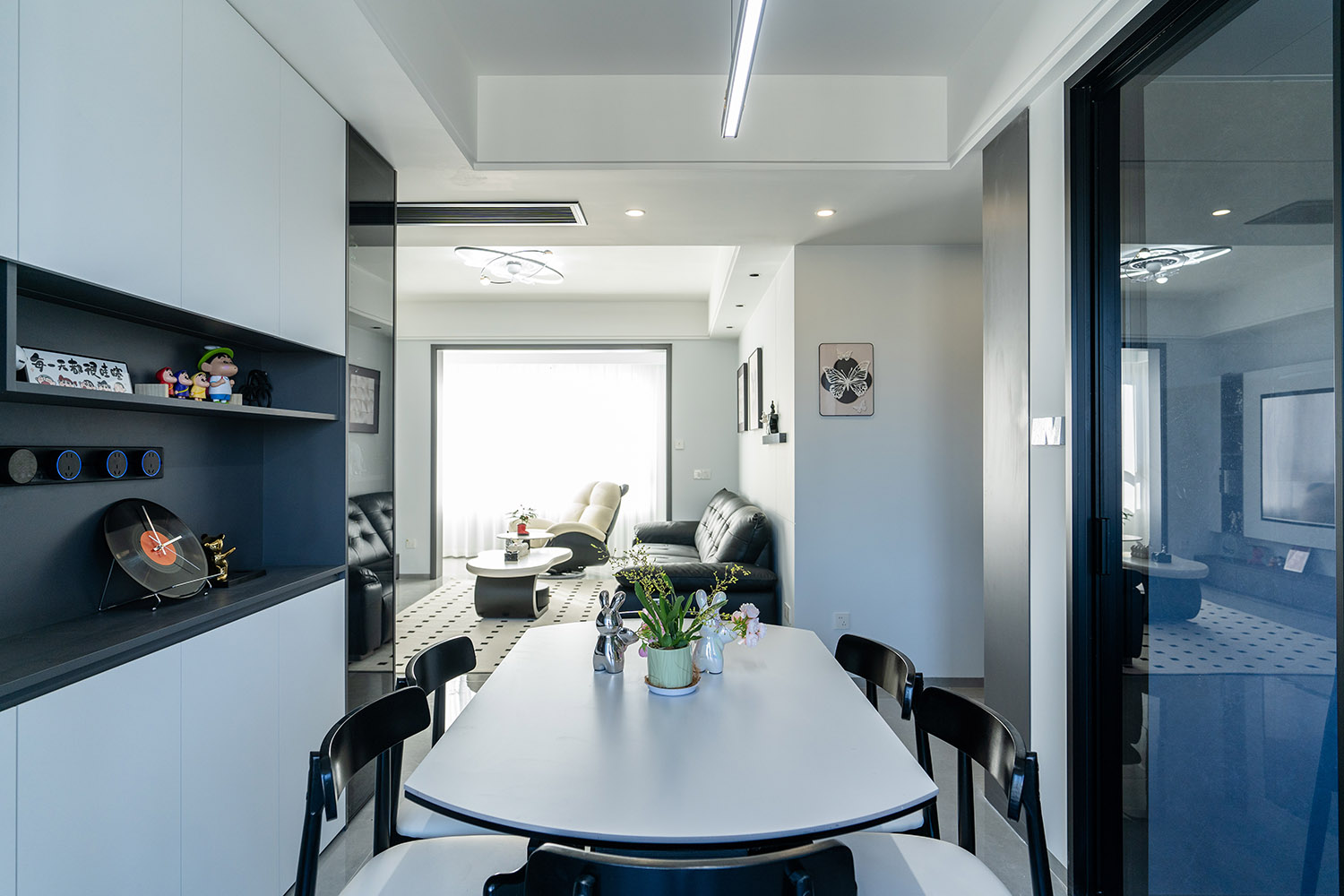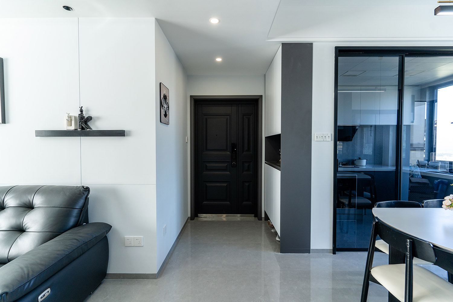 本案以“像素重組” 為核心理念,將136㎡的空間視作一個可以拆解與重構(gòu)的光影實(shí)驗(yàn)室。設(shè)計放棄所有裝飾性色彩,通過黑、白、灰三種基色的極致比例控制、不同材質(zhì)在單一色系下的質(zhì)感博弈以及精密計算的光影路徑,構(gòu)筑一個理性冷靜又充滿感知張力的未來居所。這里不是色彩的缺失,而是將色彩解構(gòu)為更本質(zhì)的光、影與肌理,讓居住回歸材料與空間的本質(zhì)對話。 通過極致的黑白灰控制與材料實(shí)驗(yàn),探索了現(xiàn)代居住的一種可能性:當(dāng)色彩被剝離,空間的形式、光影與質(zhì)感便被無限放大,人對空間的感知也因此變得更為敏銳和直接。它并非一個“冷淡”的空間,而是一個高度凝練、充滿理性之美并能包容居住者所有情緒與生活的“寧靜背景板”。在這里,一幅畫、一株綠植、一本書,乃至居住者本身,都將成為空間中最生動、最富色彩的焦點(diǎn)。