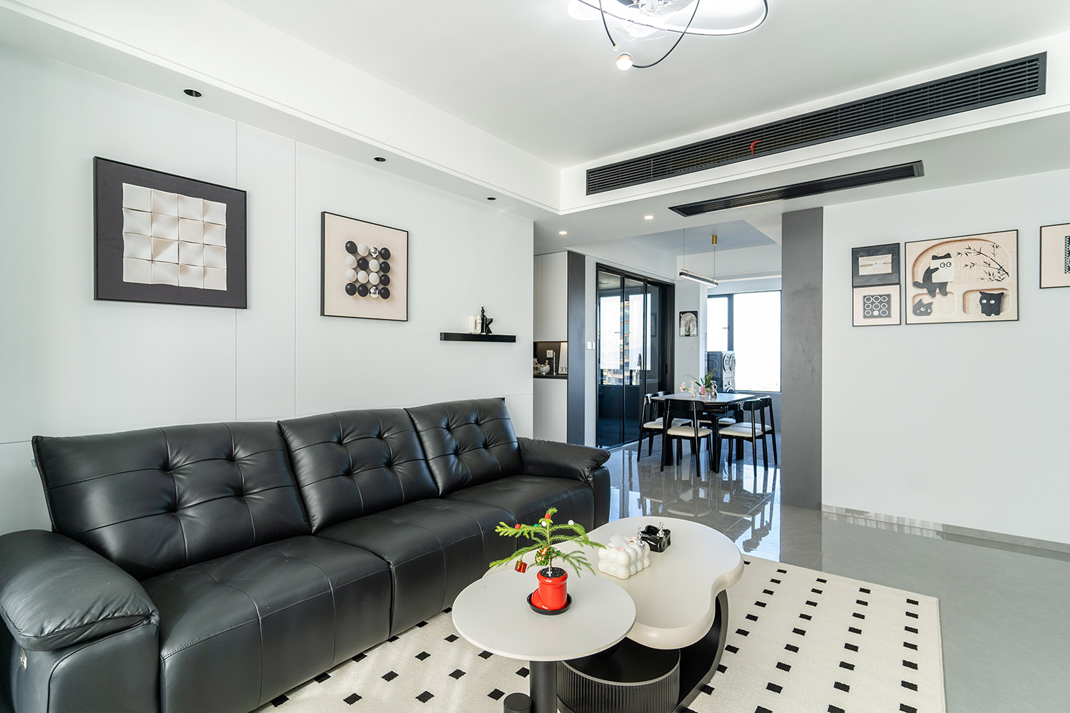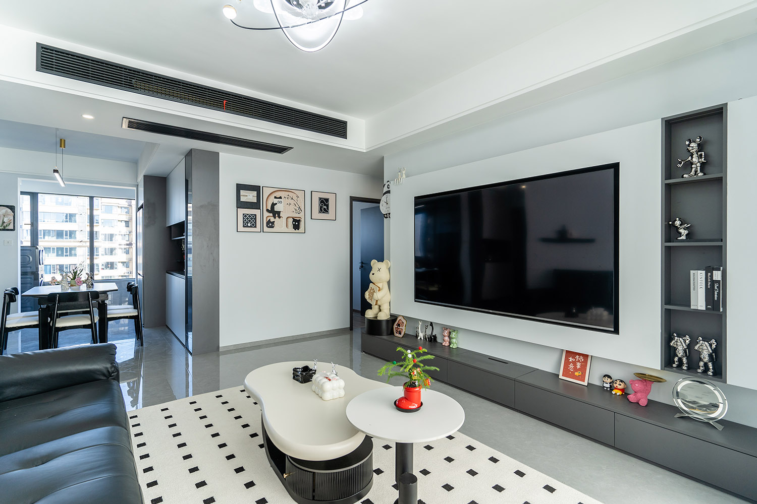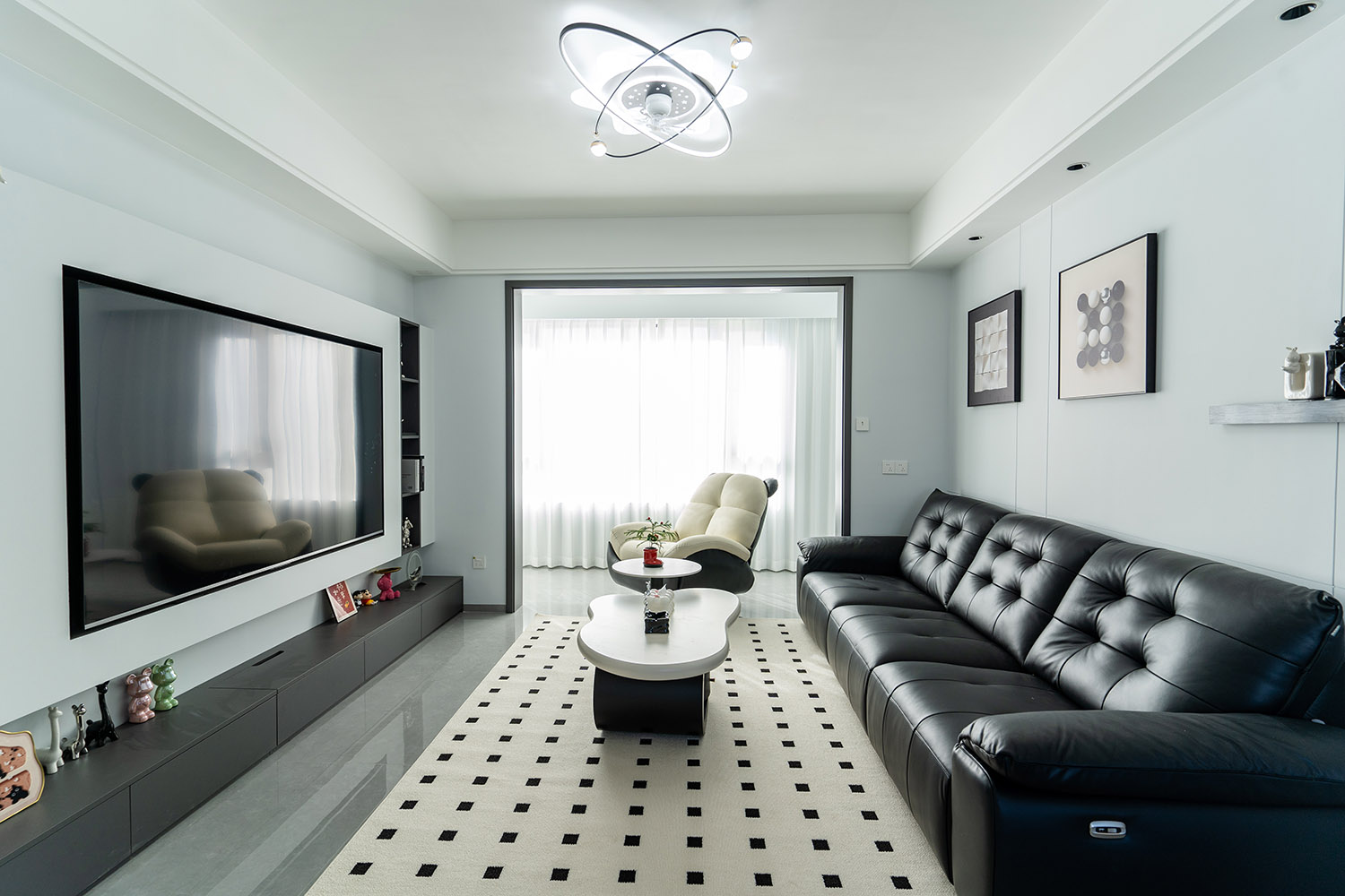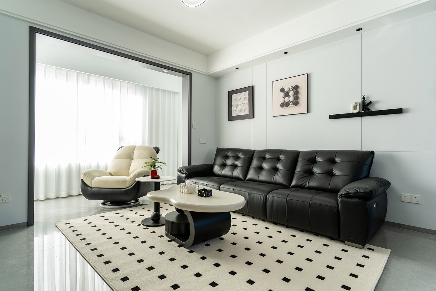 本案以“像素重組” 為核心理念,將136㎡的空間視作一個可以拆解與重構(gòu)的光影實(shí)驗(yàn)室。設(shè)計放棄所有裝飾性色彩,通過黑、白、灰三種基色的極致比例控制、不同材質(zhì)在單一色系下的質(zhì)感博弈以及精密計算的光影路徑,構(gòu)筑一個理性冷靜又充滿感知張力的未來居所。這里不是色彩的缺失,而是將色彩解構(gòu)為更本質(zhì)的光、影與肌理,讓居住回歸材料與空間的本質(zhì)對話。 通過極致的黑白灰控制與材料實(shí)驗(yàn),探索了現(xiàn)代居住的一種可能性:當(dāng)色彩被剝離,空間的形式、光影與質(zhì)感便被無限放大,人對空間的感知也因此變得更為敏銳和直接。它并非一個“冷淡”的空間,而是一個高度凝練、充滿理性之美并能包容居住者所有情緒與生活的“寧靜背景板”。在這里,一幅畫、一株綠植、一本書,乃至居住者本身,都將成為空間中最生動、最富色彩的焦點(diǎn)。