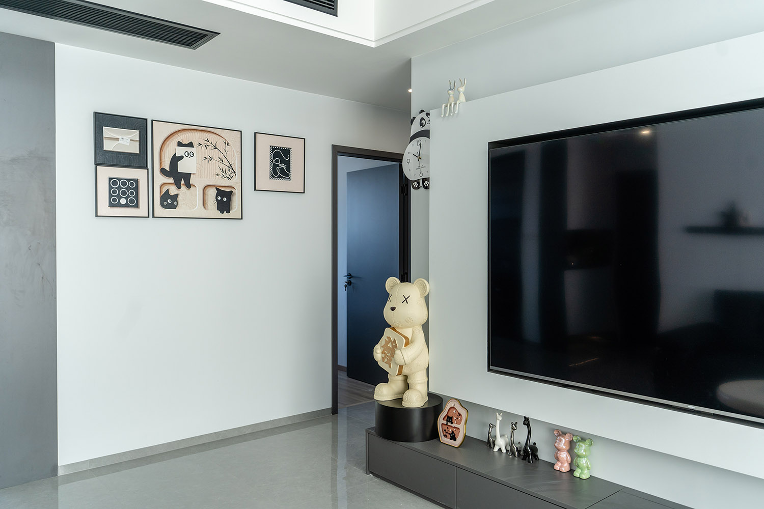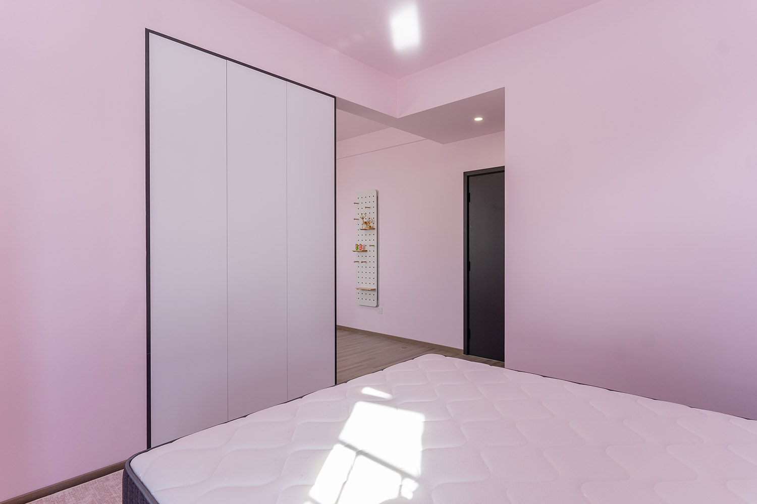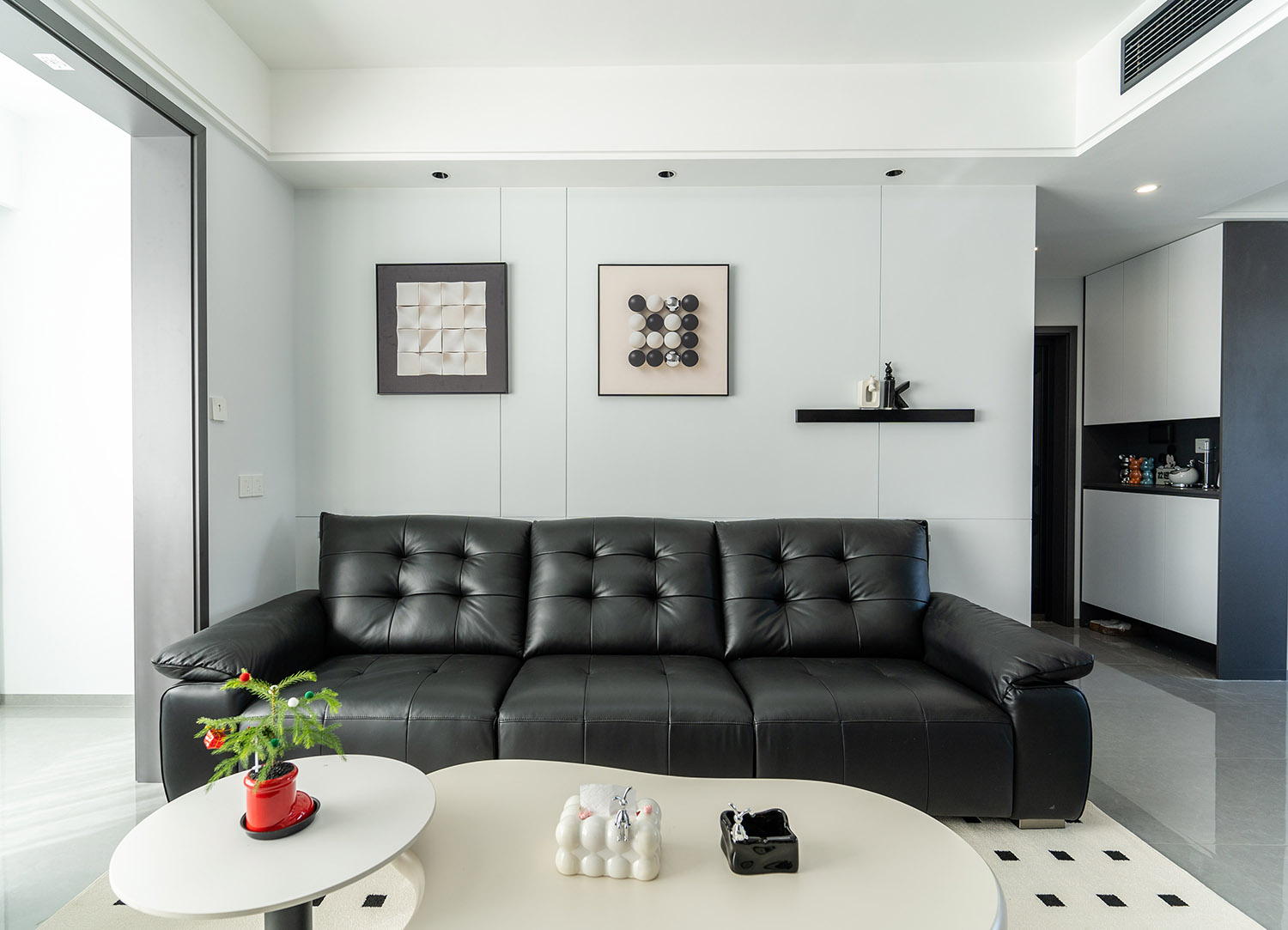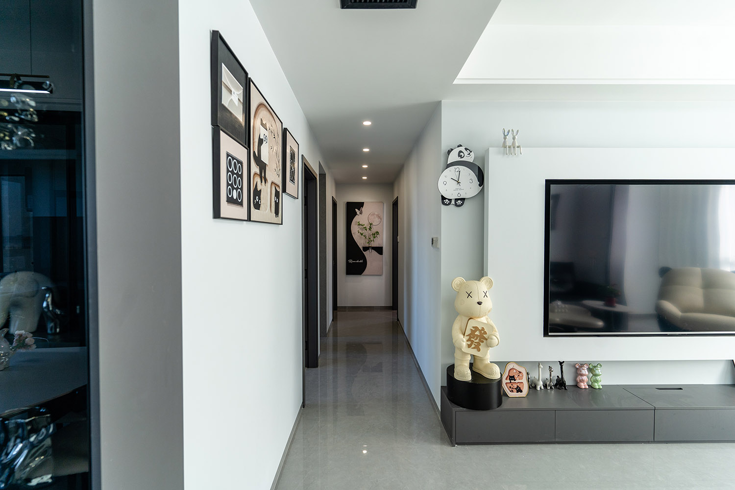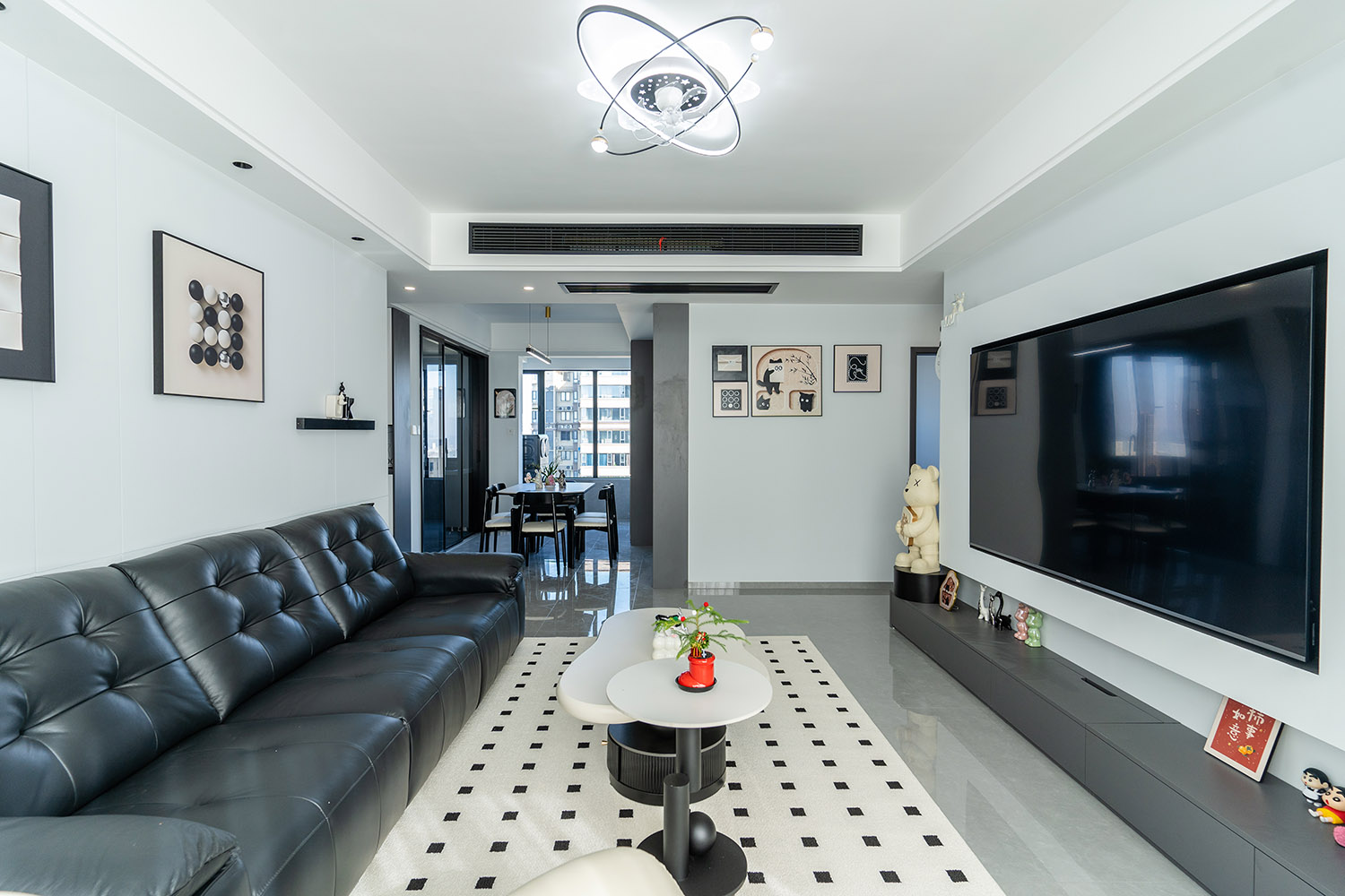 本案以“像素重組” 為核心理念,將136㎡的空間視作一個可以拆解與重構(gòu)的光影實(shí)驗(yàn)室。設(shè)計放棄所有裝飾性色彩,通過黑、白、灰三種基色的極致比例控制、不同材質(zhì)在單一色系下的質(zhì)感博弈以及精密計算的光影路徑,構(gòu)筑一個理性冷靜又充滿感知張力的未來居所。這里不是色彩的缺失,而是將色彩解構(gòu)為更本質(zhì)的光、影與肌理,讓居住回歸材料與空間的本質(zhì)對話。 通過極致的黑白灰控制與材料實(shí)驗(yàn),探索了現(xiàn)代居住的一種可能性:當(dāng)色彩被剝離,空間的形式、光影與質(zhì)感便被無限放大,人對空間的感知也因此變得更為敏銳和直接。它并非一個“冷淡”的空間,而是一個高度凝練、充滿理性之美并能包容居住者所有情緒與生活的“寧靜背景板”。在這里,一幅畫、一株綠植、一本書,乃至居住者本身,都將成為空間中最生動、最富色彩的焦點(diǎn)。