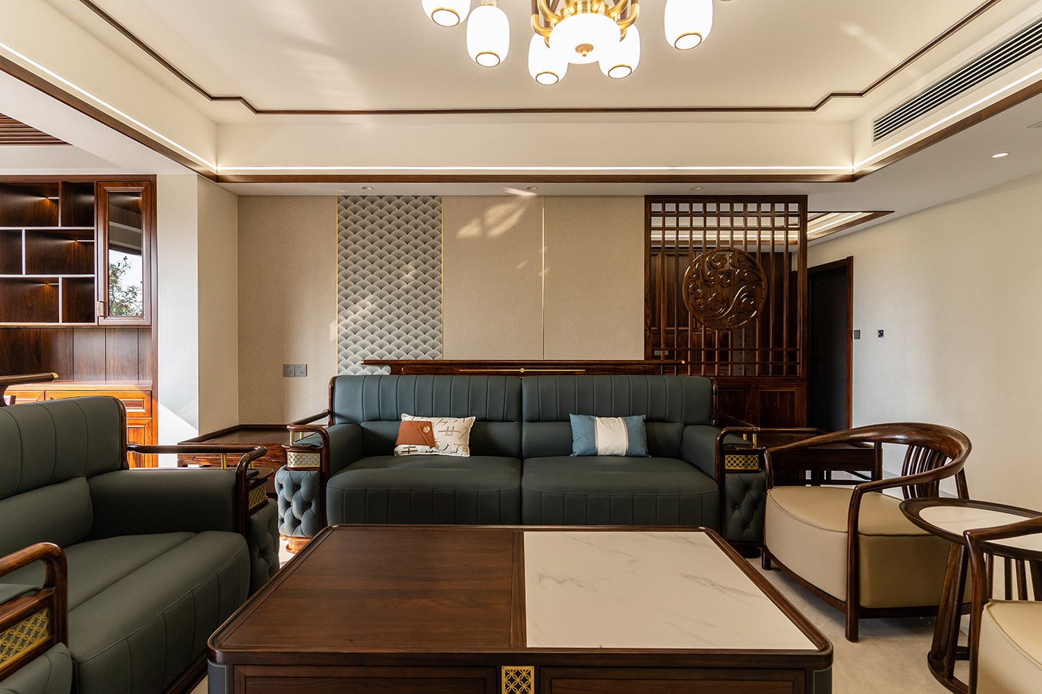 新中式風(fēng)格,是東方美學(xué)精神在現(xiàn)代語境下的華麗轉(zhuǎn)身與集大成者。在220平米的寬闊天地里,它得以超越符號化的堆砌,轉(zhuǎn)而通過宏大的空間敘事、深層的材質(zhì)對話與詩意的意境營造,打造一座兼具文化傳承、家族風(fēng)范與當(dāng)代舒適的傳世大宅。 本案的核心設(shè)計理念是 “大象無形,大音希聲” 。旨在以恢弘的空間尺度,承載最含蓄內(nèi)斂的東方意境。設(shè)計追求的不是形式的繁復(fù),而是空間氣場、文脈氣韻與生活氣息的完美融合。通過中軸對稱、虛實相生、框景借景等傳統(tǒng)造園手法,在現(xiàn)代大宅的框架內(nèi),營造出一種可供三代同堂觀想、品鑒與傳承的居住體驗。