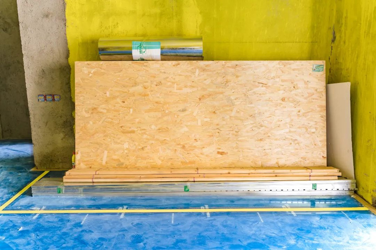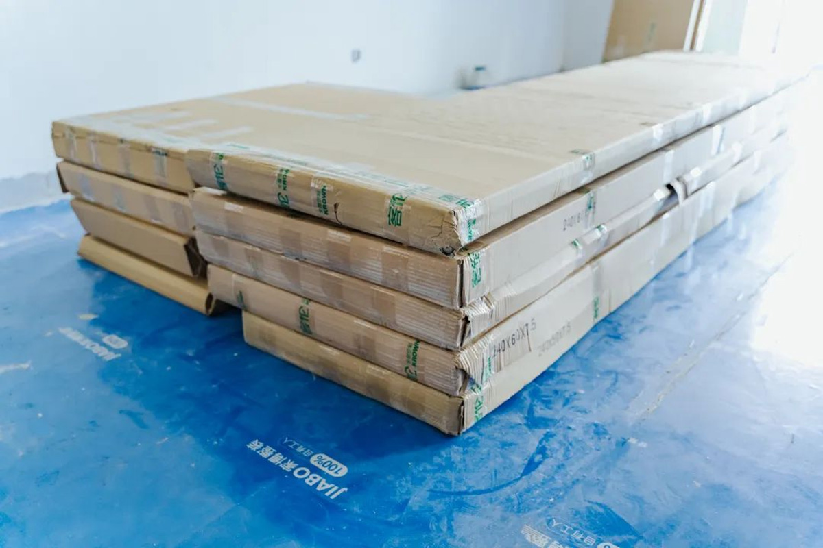 水電位置張貼警示條,后期打孔可以避開水電位置;板材并排碼放整齊,均放置在黃框內,一目了然。